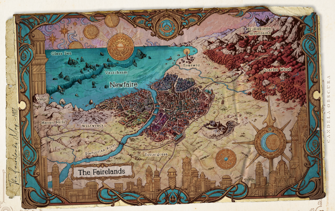 In the northern country of Hale lies the fertile valley known as the Fairelands, a diverse and prosperous region currently recovering from a brutal six-year war. On its western coast sits the central hub of politics and progress, the capital city of Newfaire.