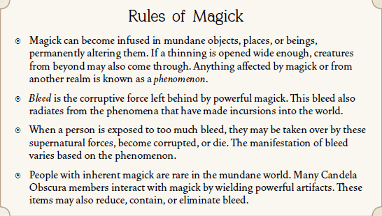 Candela Obscura is a TTRPG (Tabletop Role-Playing Game), built on the Illuminated Worlds System, about occult investigators hunting down the dangerous supernatural forces and making incursions into a world very much like your own.